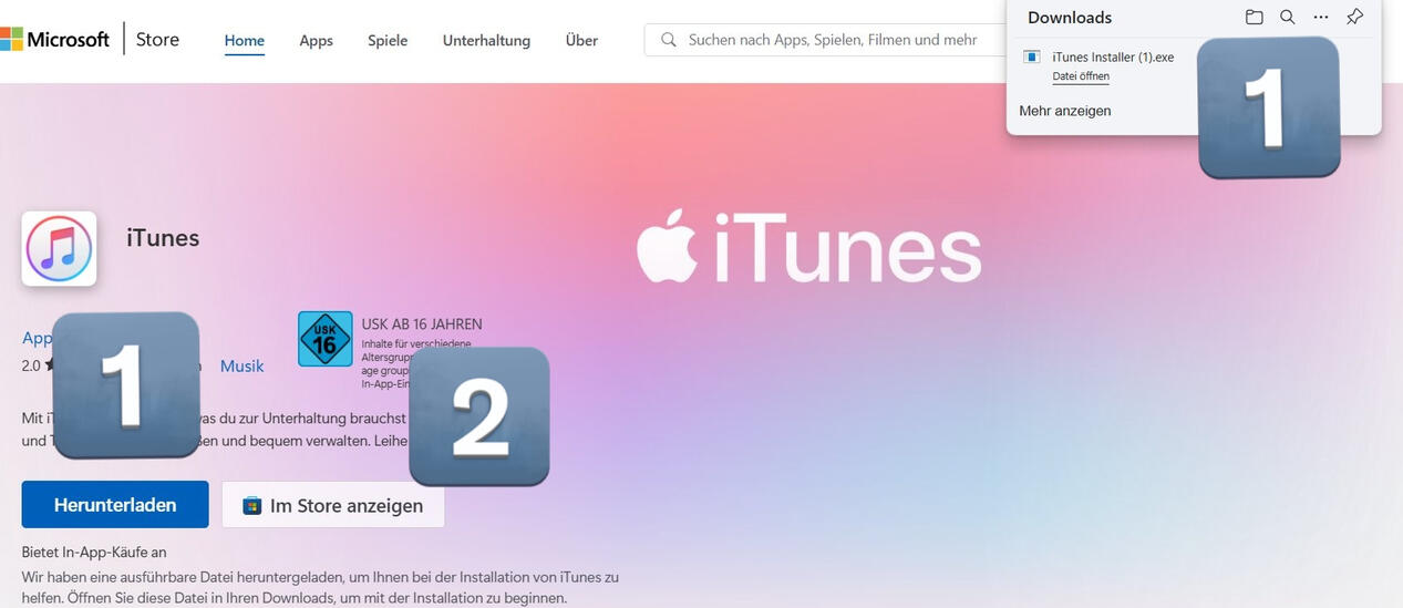 🇬🇧 2. When done install iTunes on Windows device.Visit https://apps.microsoft.com. There are 2 options to install it.First is an old-fashioned executable file that you have to install on your own.The second and easier one is to go to the Microsoft Store (Im Store anzeigen).