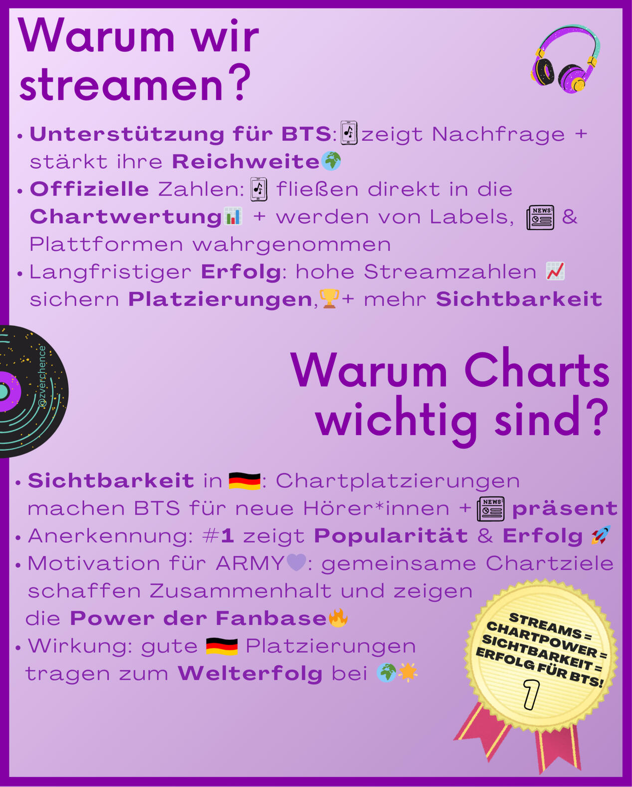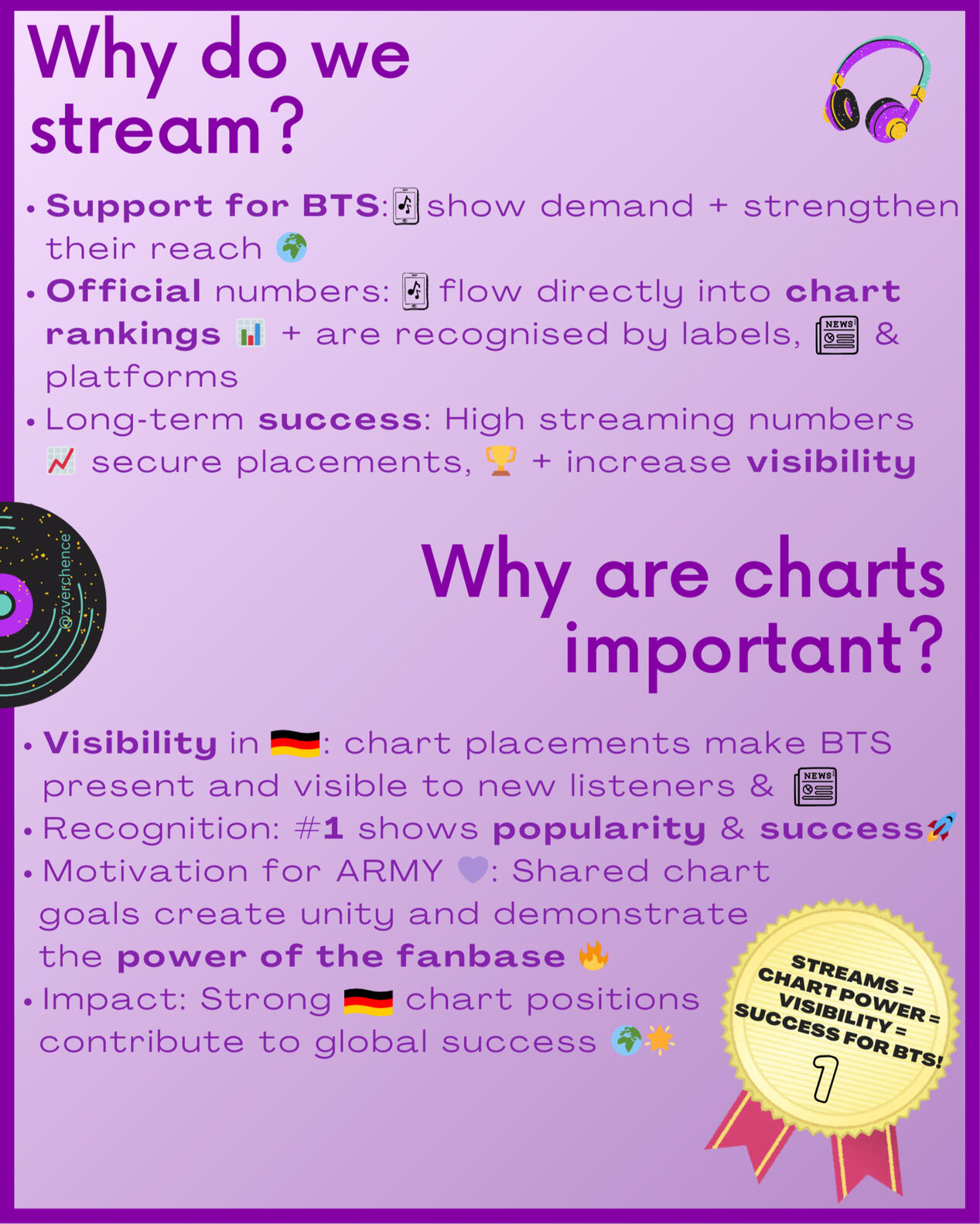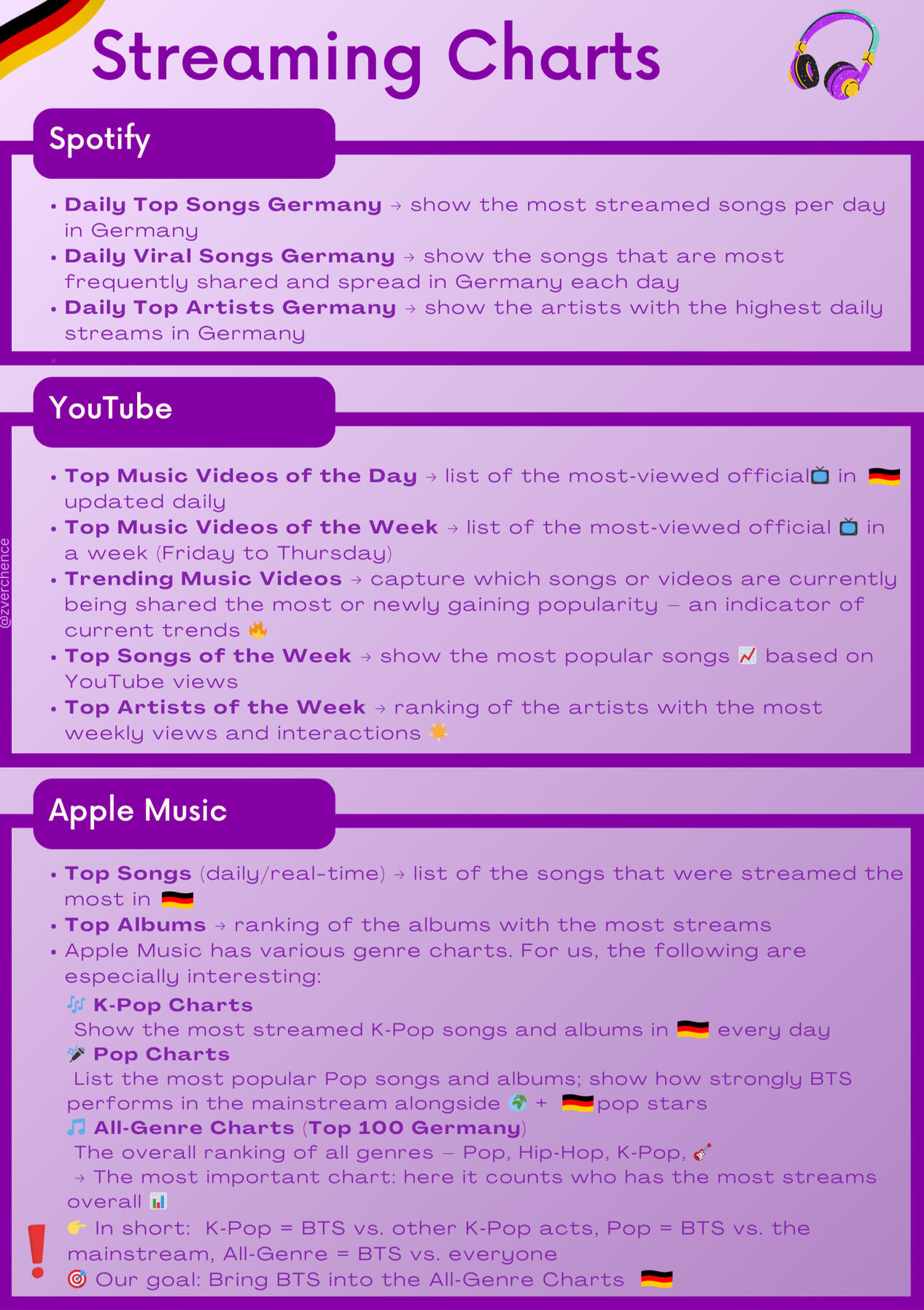 AM bietet mehrere Genre Charts. Unser Ziel ist es, zuerst in K‑Pop zu charten, dann in Pop und schließlich im All‑Genre Chart 🎯All‑Genre heißt: Bangtan chartet neben den Weltstars. Genau da gehören sie hin 💫Deutschland ist eines von fünf Ländern, in denen Streams zu 100 % in die weltweite Chartwertung einfließen. Das stärkt die Chancen von Songs auf weltweite Platzierungen.💜 Holt euch die AM‑Probeabos (falls ihr AM noch nicht nutzt) und lasst uns unser Bestes geben 💜Vorteile von AM: