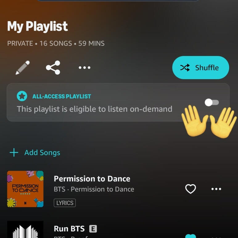 ✅ es funktioniert ohne Music Unlimited – nur mit PrimeNeue Playlist erstellen:✅ geht in der App zu "Bibliothek" → "Playlists" & wählt "Neue Playlist erstellen"✅ fügt mindestens 15 Songs hinzu (maximal 50)✅ nur dann wird die Playlist für All‑Access freigeschaltet & den Toggle kann aktiviert werden