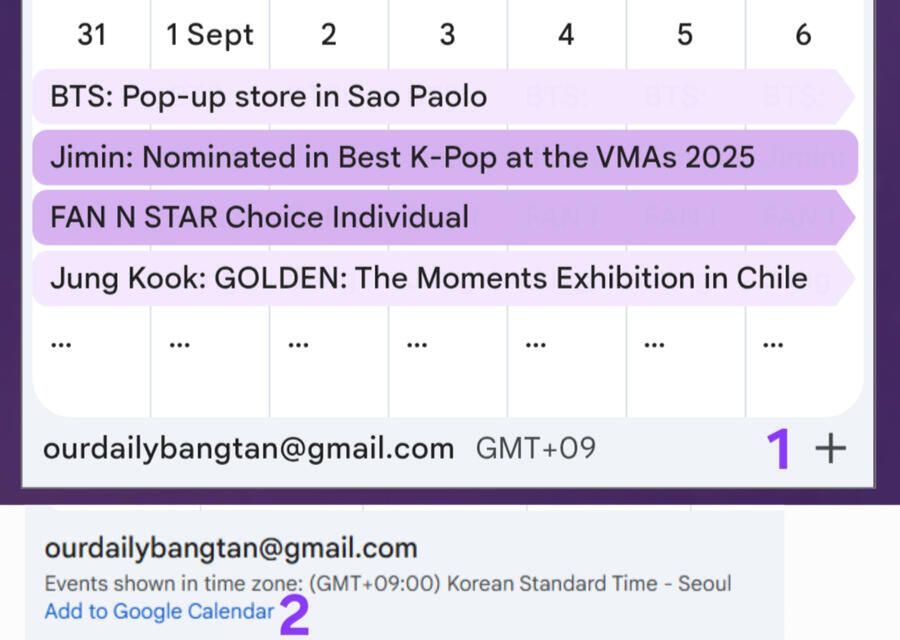 🇩🇪 Klickt auf das + unten rechts oder auf „Zu Google Kalender hinzufügen“ unten links, je nachdem, ob du die Carrd auf dem Handy oder am PC geöffnet hast.Der Kalender hier auf der Carrd ist in KST, zeigt die Events nach der Integration aber automatisch in der lokalen Zeit an.Hinweis:
