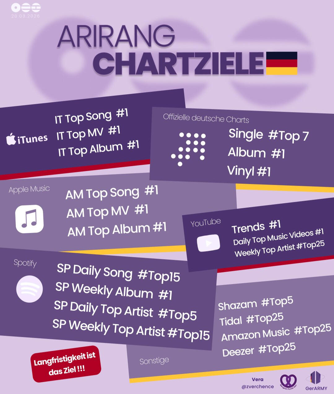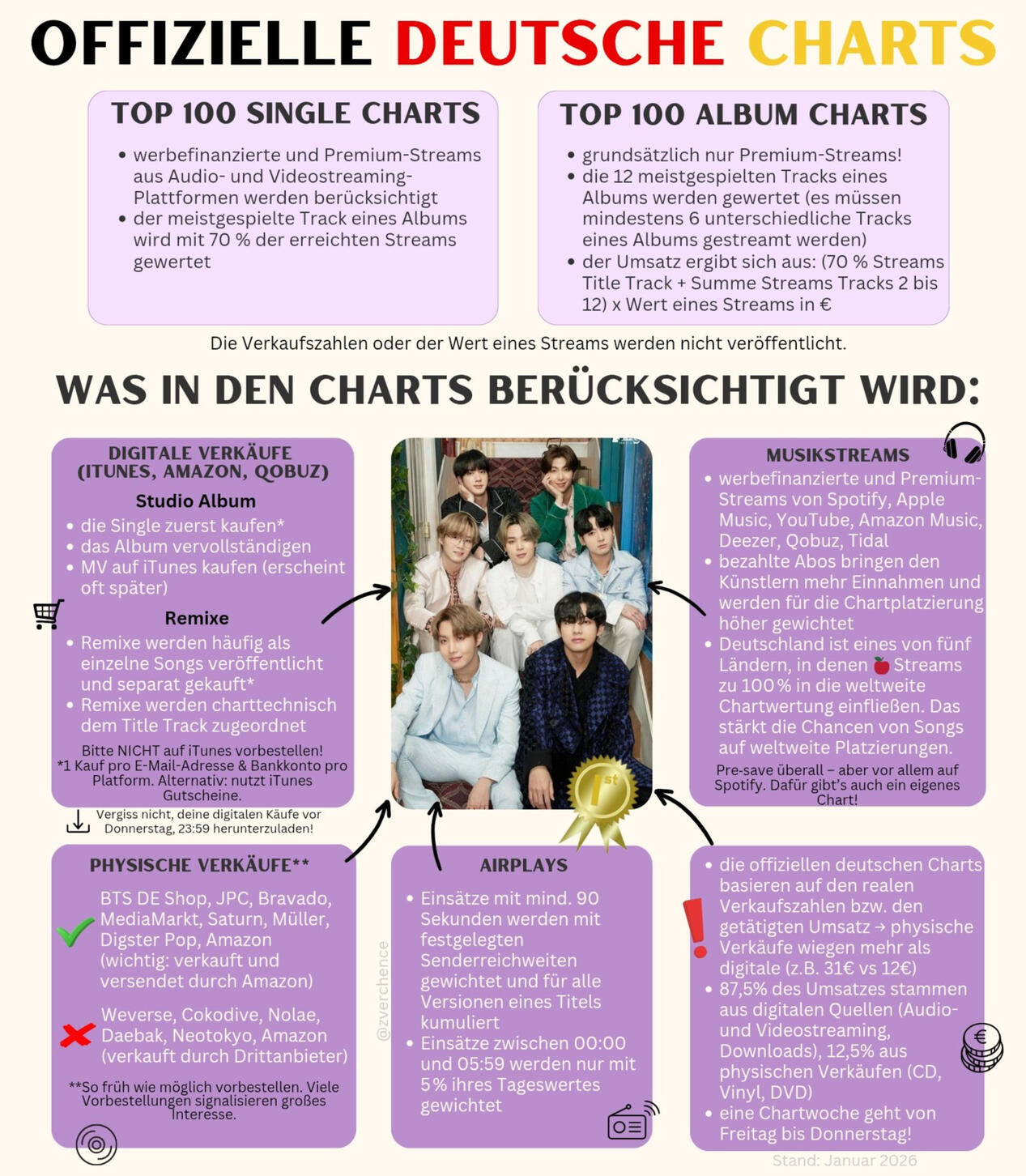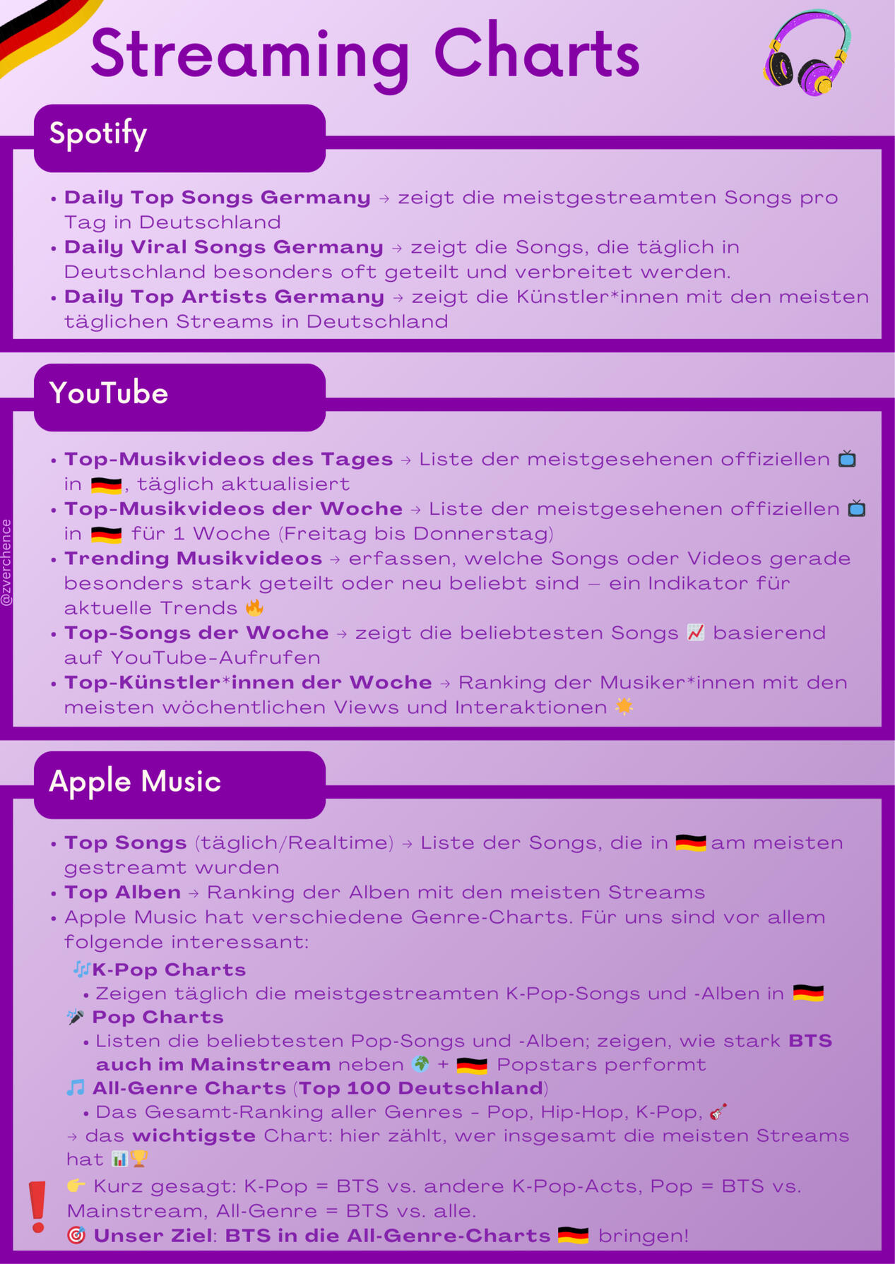 AM bietet mehrere Genre Charts. Unser Ziel ist es, zuerst in K‑Pop zu charten, dann in Pop und schließlich im All‑Genre Chart 🎯All‑Genre heißt: Bangtan chartet neben den Weltstars. Genau da gehören sie hin 💫Deutschland ist eines von fünf Ländern, in denen Streams zu 100 % in die weltweite Chartwertung einfließen. Das stärkt die Chancen von Songs auf weltweite Platzierungen.💜 Holt euch die AM‑Probeabos (falls ihr AM noch nicht nutzt) und lasst uns unser Bestes geben 💜Vorteile von AM: