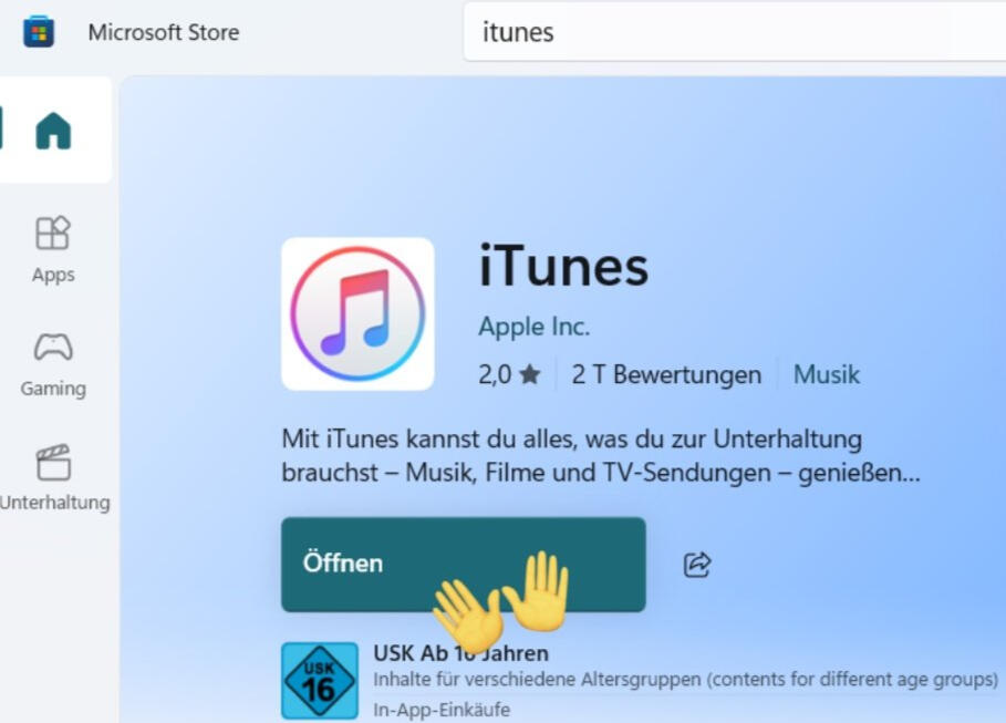 🇬🇧 2. When done install iTunes on Windows device.Visit https://apps.microsoft.com. There are 2 options to install it.First is an old-fashioned executable file that you have to install on your own.The second and easier one is to go to the Microsoft Store (Im Store anzeigen).